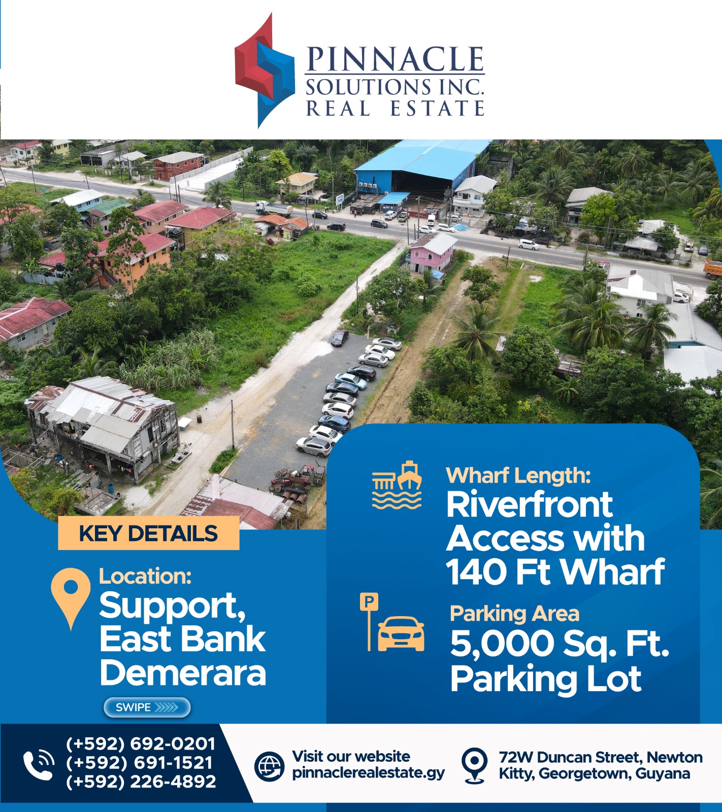 Position your business for success with this prime industrial wharf property located at Support, East Bank Demerara. Designed for heavy-duty industrial, shipping, and logistical operations, this facility combines expansive space, robust infrastructure, and direct riverfront access — making it ideal for large-scale industrial or maritime use.