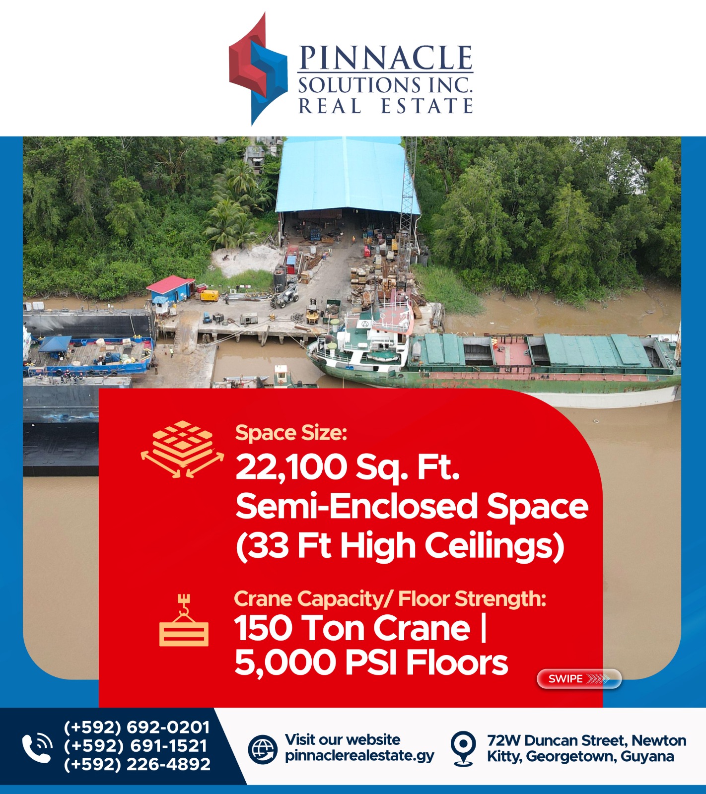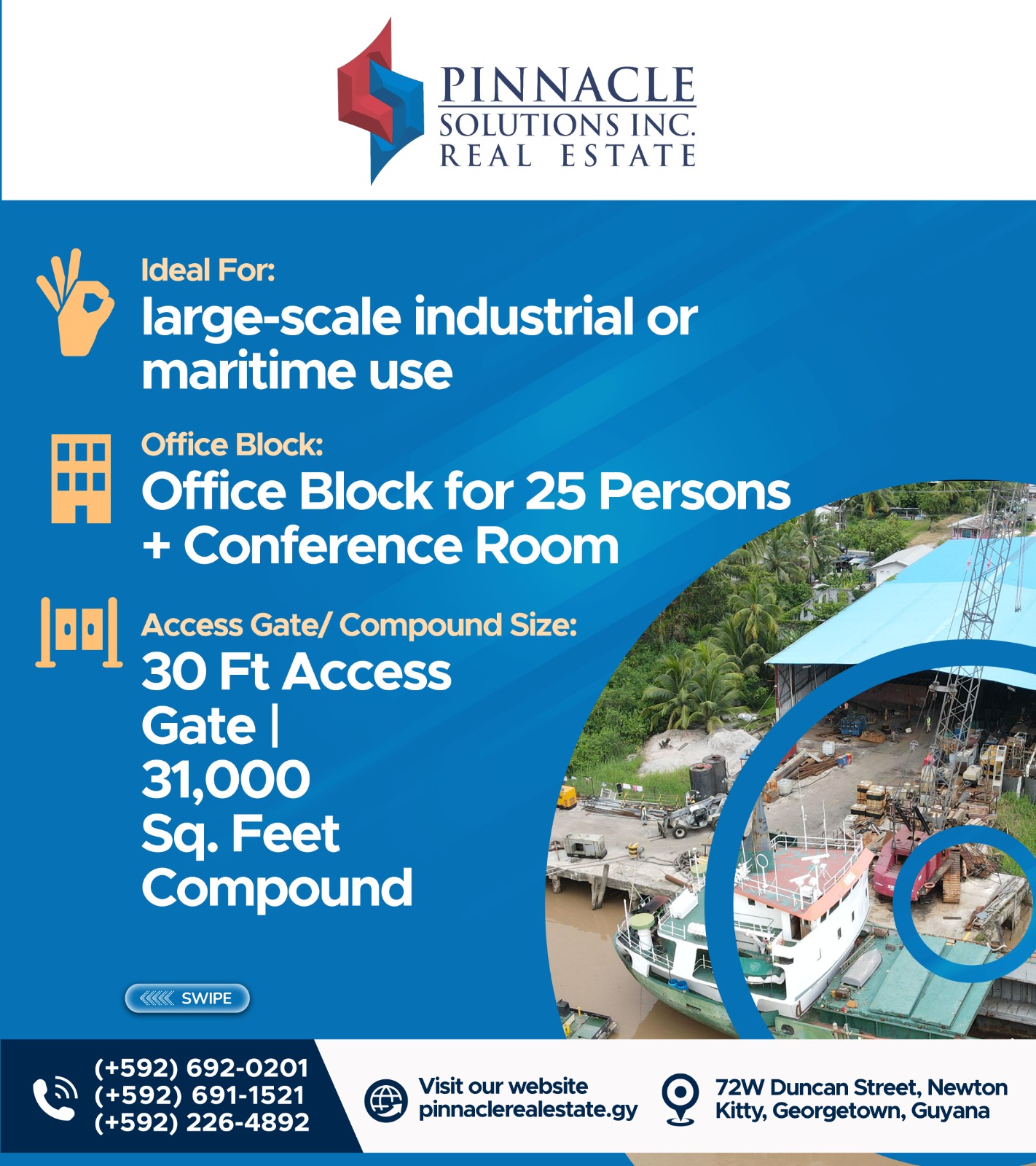 This exceptional industrial property offers a rare combination of space, access, and capacity — perfectly suited for shipping, logistics, or manufacturing operations seeking a strategic waterfront location along the East Bank Demerara.